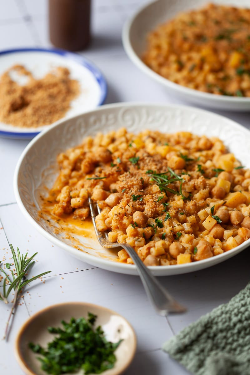 These Moroccan Spiced Chickpeas in rich tomato sauce are comforting and easy to make. Vegan, one-pot, and perfect for weeknight dinners.